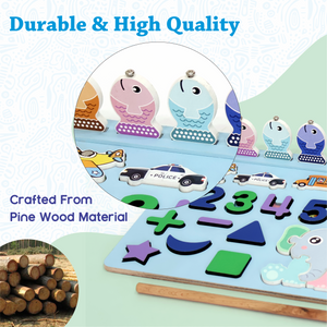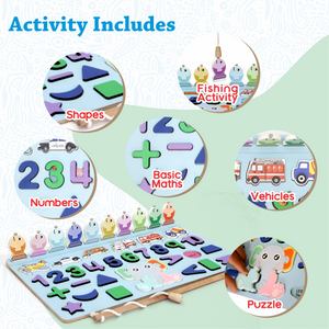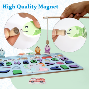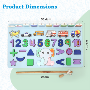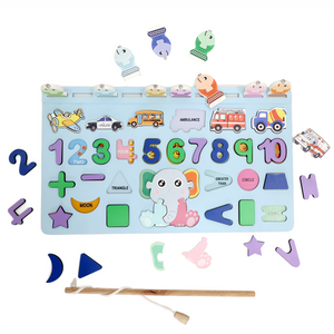 This all-in-one activity board promotes educational fun through multiple learning dimensions: shape and color sorting, alphabet recognition, number matching, and mathematical symbol activities. It also features magnetic games with 10 wooden fish that can be caught using the magnetic rod, adding excitement to every play session.