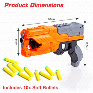 - Includes: 1 Six-Fire Gun, 10 Soft Foam Bullets