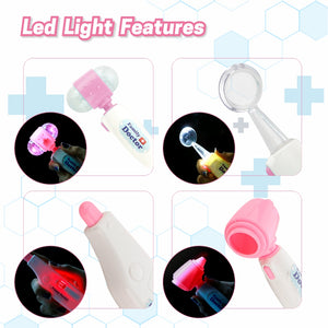 ✨ LED Light-Powered Instruments – The set includes 5 doctor tools with LED lights: stethoscope, hammer, autoscope, thermometer & mirror, making it exciting and realistic.