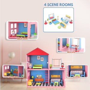 Chanak Wooden Doll House for Kids – 4 Room Doll House Set with 16 Pieces
