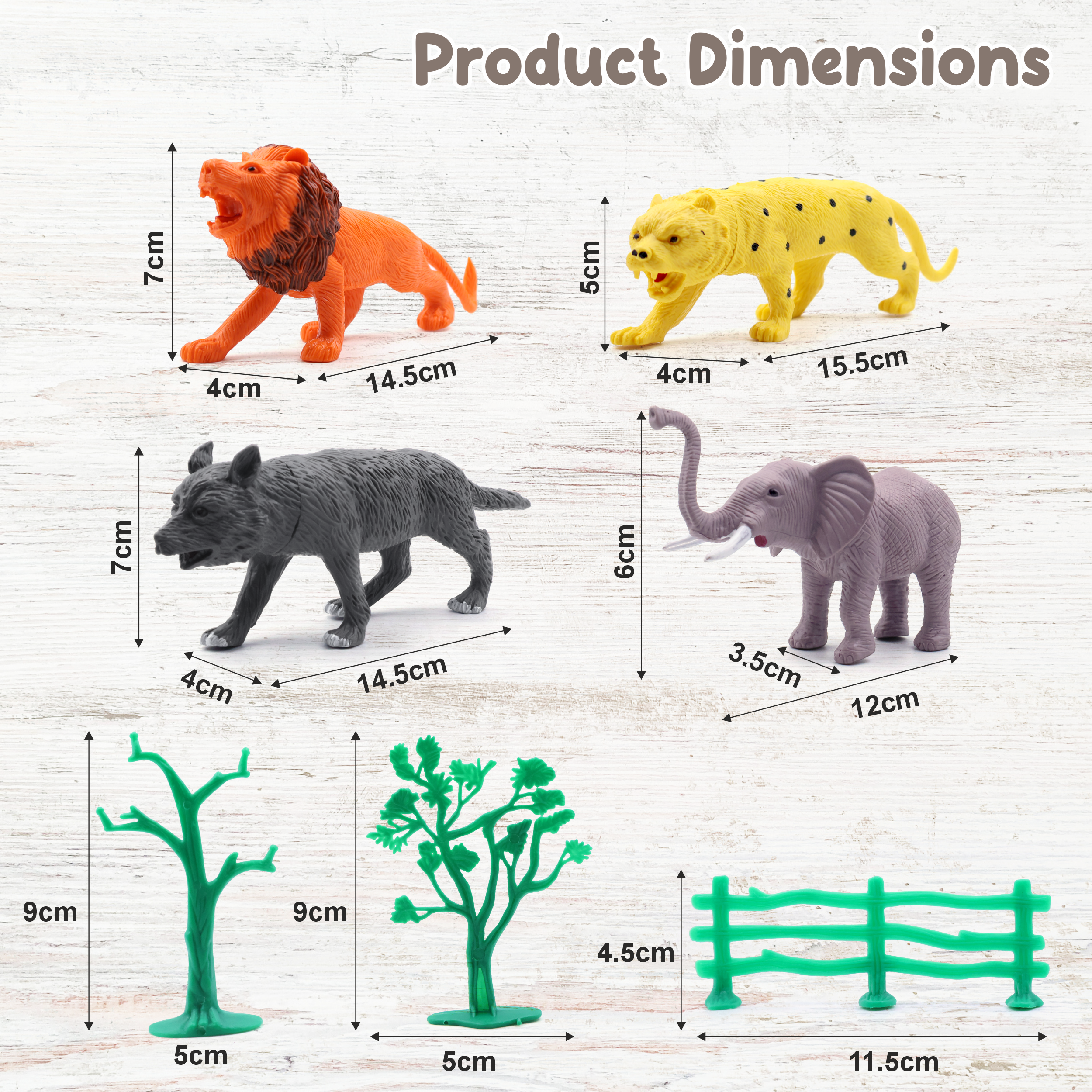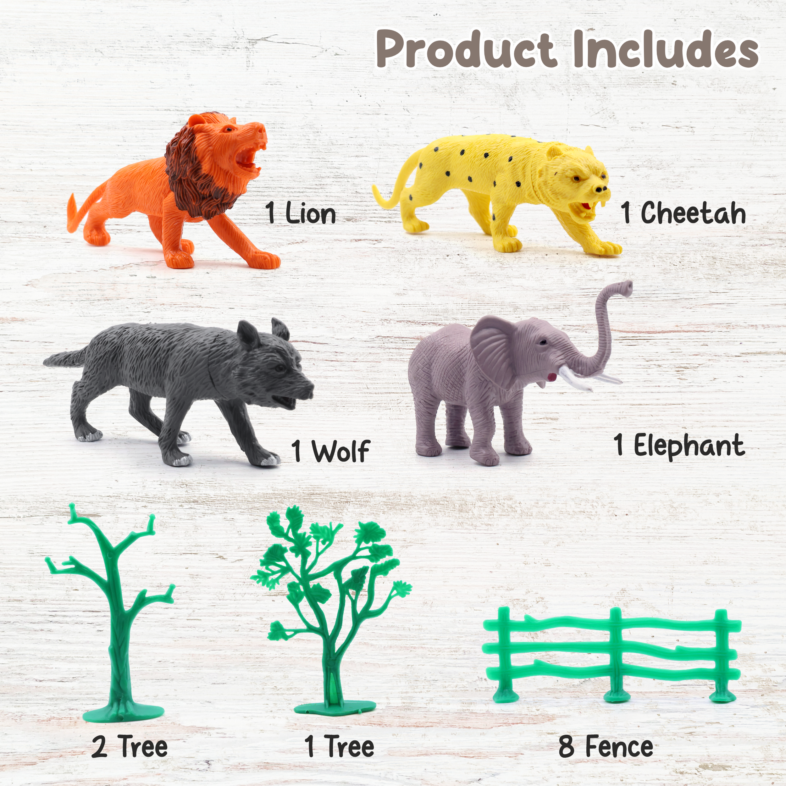 🌳 Complete Playset – This wild animals toys set includes 8 hand-painted animals (lion, elephant, cheetah, wolf, and more), 8 fences, and 3 trees—creating a realistic mini forest wild animals play environment.